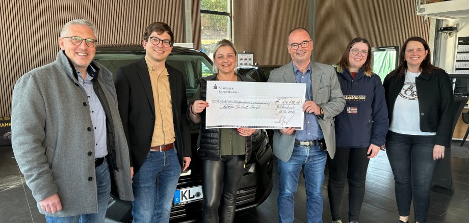 Bürgermeister Dr. Peter Degenhardt hat gemeinsam mit der 1. Beigeordneten Nicole Meier, den Abteilungsleitern Christopher Bretscher und Heiko Westrich sowie der Klimaschutzmanagerin der Verbandsgemeinde Meike Lörsch von Sarah Dechent vom Autohaus Dechent in Krickenbach fünf neue vollelektrische Autos entgegen genommen. Bezahlt wurde mit einem Riesen-Scheck.
