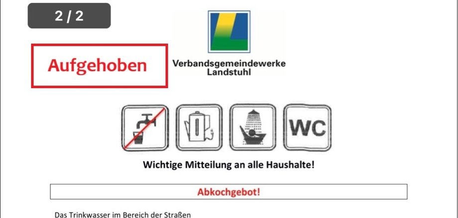 Damit ist das Abkochgebot für das Trinkwasser im betroffenen Teil der Sickingenstadt Landstuhl ab sofort aufgehoben.