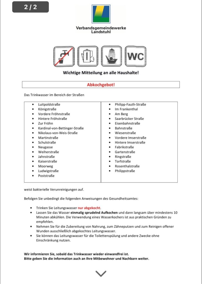 Bezüglich des gestrigen Warnhinweises zur bakteriellen Verunreinigung des Trinkwassers in Teilen von Landstuhl gilt: Es handelt sich um eine Vorsichtsmaßnahme, eine akute Gesundheitsgefahr besteht nicht!
